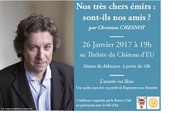 Christian CHESNOT à EU le 26 janvier 2017 à 18 h au Théâtre du Château. Séance de dédicaces suivie de la conférence à 19 h. Son livre « nos très chers émirs sont-ils nos amis? ». L’entrée est libre, une quête aura lieu au profit de Reporters sans frontière. Cette conférence est organisée par le Rotary club d’Eu en partenariat avec la ville d’EU. en savoir plus, cliquez sur « son livre »